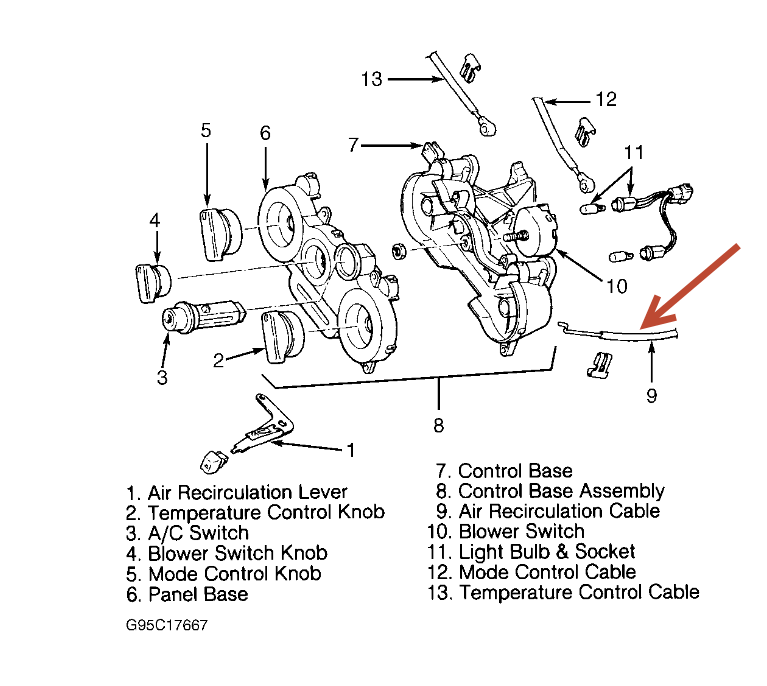 Ok check the actuator and linkage where I have pointed out on drawing. See if it's getting power or not but before you do that try pulling HVAC fuse for 60 seconds with key on then reinstalling and waiting another minute. That sometimes resets that actuator to work again. If it's getting power then you need a new actuator or blend door is broken I coldn't get all of the pic in tosend.