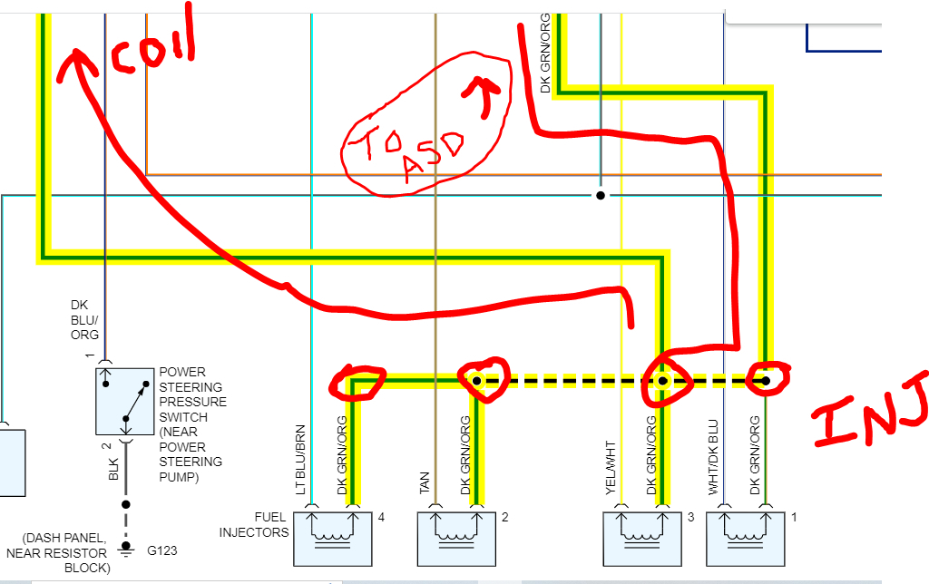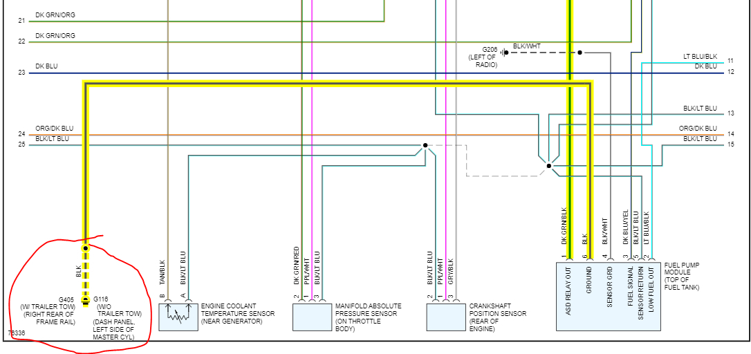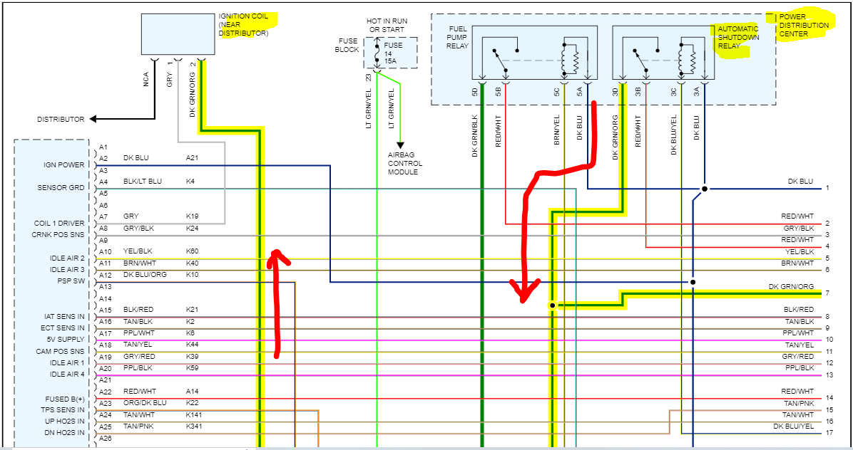 I put everything back together and drove to the gas station about 5 miles, coming home truck died on me, it fired back up and got me home. The next day I drove it about 500 feet and died again, fuel pump wasn't working, at this point I did not notice the blown ASD fuse. The fuel pump would not pump, and the electric fan would stay on with key on, I unplugged the ASD relay, and the pump would work, but engine wasn't getting spark or fuel pressure was bad.
