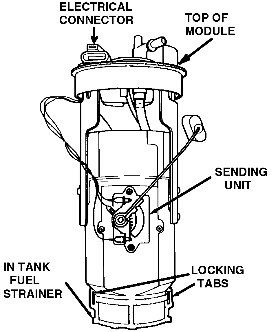 5. Remove the fuel pump module from the fuel tank, being careful not to bend the sending unit float arm.