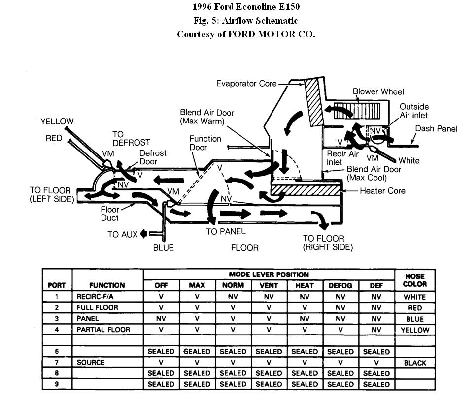 3. If constant hiss is heard, cycle function selector with blower motor on HI speed and check location of discharged air. Airflow schematic and vacuum control chart indicate which vacuum motors are operated for each function selector lever position. See Fig. 5. If