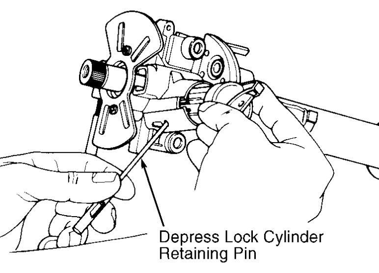 2. Using key,  turn lock cylinder to RUN position. Using a 1/8" (3.17 mm) diameter pin or punch,  depress retaining pin locate