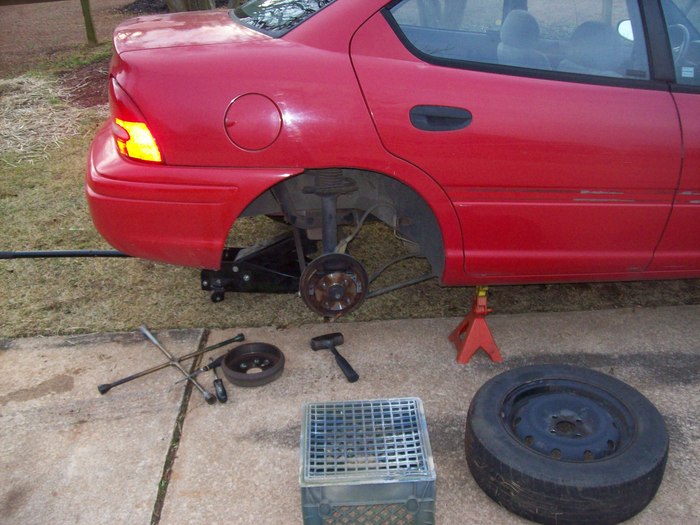 I JACKED HIM UP AND PLAYED WITH THE WHEEL TO SEE IF IT WAS A BEARING ISSUETHEN I DROPPED HIM, BROKE THE LUG NUTS AND JACKED HIM BACK UP, THEN SNATCHED THE WHEEL AND DRUM OFF