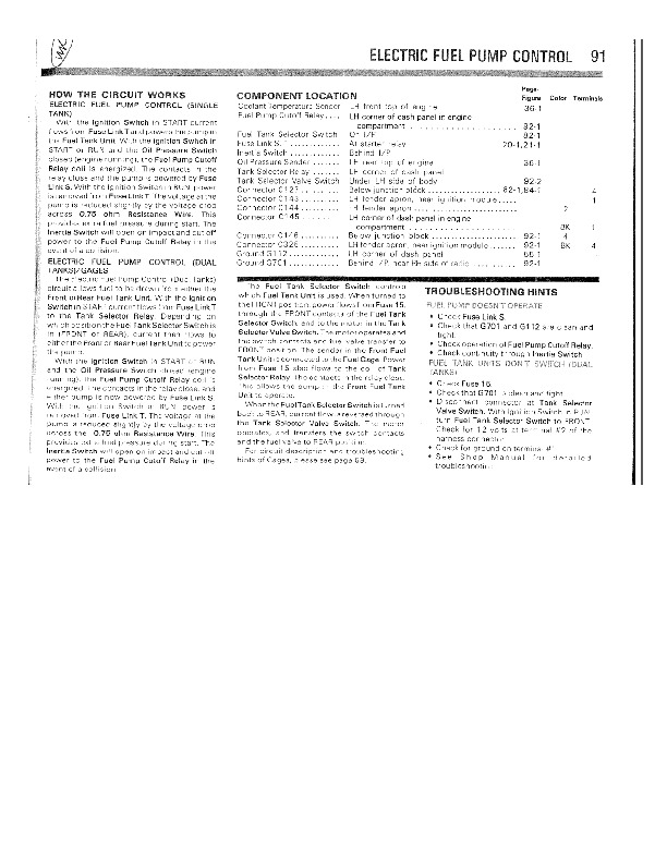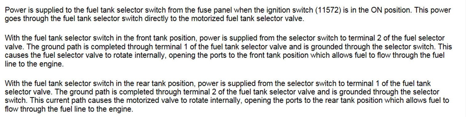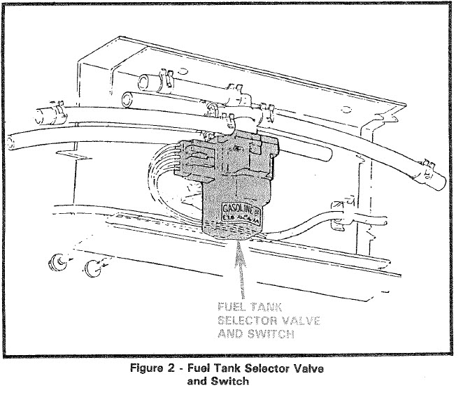 Voltage from fuse 6 is supplied to the fuel tank selector switch when the ignition switch is in START or RUN. The position of the fuel tank selector switch determines the direction in which the fuel tank selector valve motor will move. It also determines which fuel tank sender will control the fuel gauge operation.