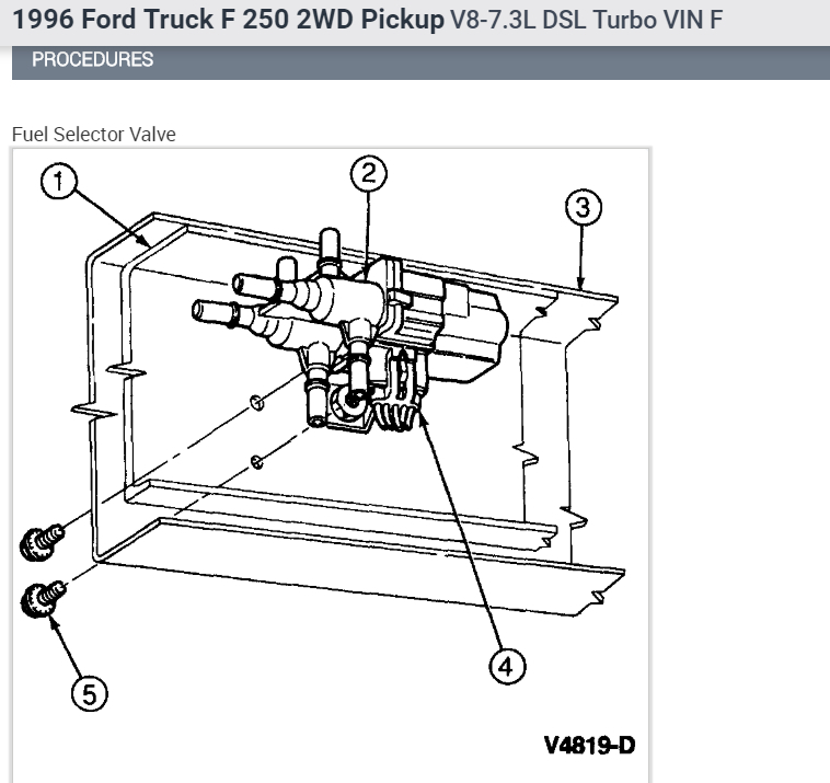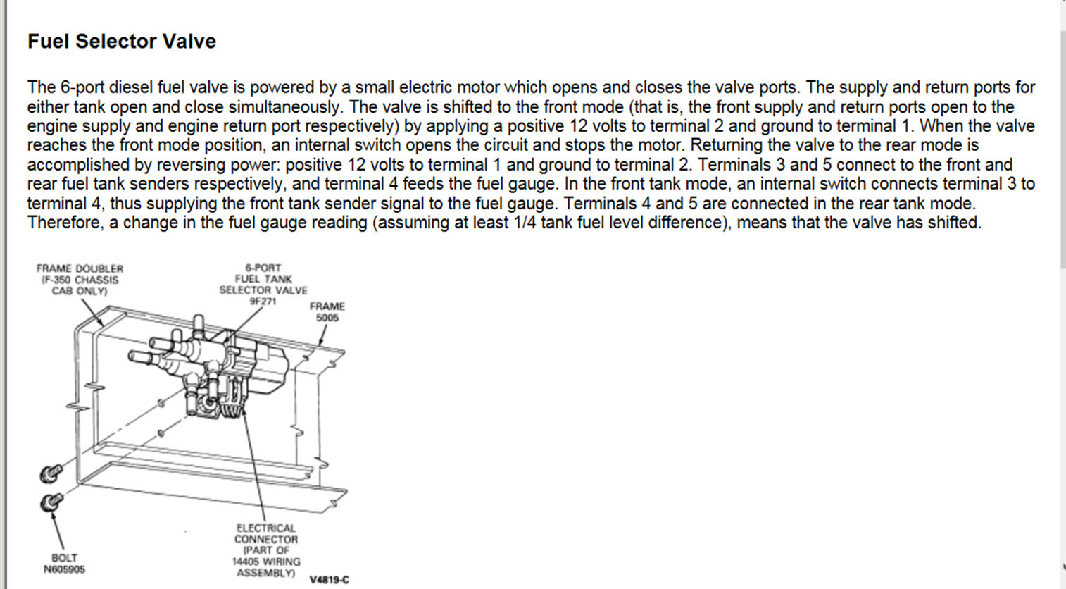 Those trucks had a big problem with the switch valve down on the frame rail between the tanks. Here is a diagram (below) of what the valve looks like.