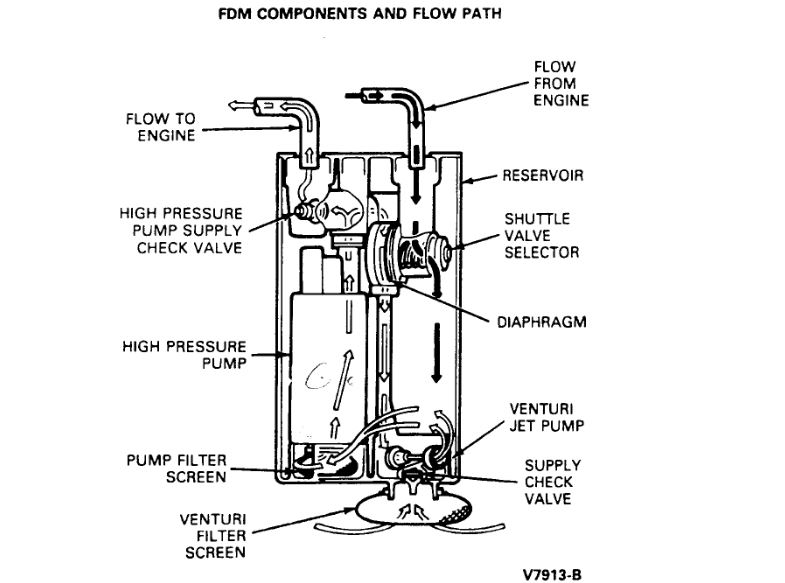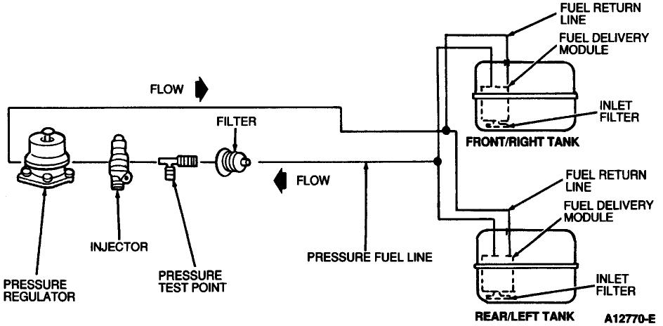 FUEL DELIVERY System Types Electric fuel delivery systems differ in design depending on model. System designs use one of the following configurations: Single tank with a single fuel pump. Single tank with one Fuel Delivery Assembly (FDA). See Fig. 2 . Dual tank with one FDA per tank. Fuel Delivery Assembly (FDA) The FDA consists of a fuel pump inside a reservoir that is attached to the pump and sender assembly. See Fig. 2 . In a 2-tank system there is one FDA per tank. Fuel sender assembly handles the fuel switching through internal valves. Fuel reservoir is used to prevent fuel flow interruptions during extreme vehicle maneuvers when fuel tank level is low. Reservoir is located in-tank and is either molded or welded into fuel tank or is part of FDA. Shuttle valve opens fuel return line to fuel tank when fuel pressure on shuttle diaphragm exceeds opposing check valve spring force. When pump is de-energized, supply check valve closes to maintain pump prime and fuel supply line pressure. A portion of high pressure flow from the pump is diverted to operate the venturi jet pump. The jet pump draws fuel from the tank into the FDA. This ensures adequate fuel supply during extreme vehicle maneuvers and steep vehicle attitudes when fuel level is low. If FDA is defective, it must be replaced as an assembly.