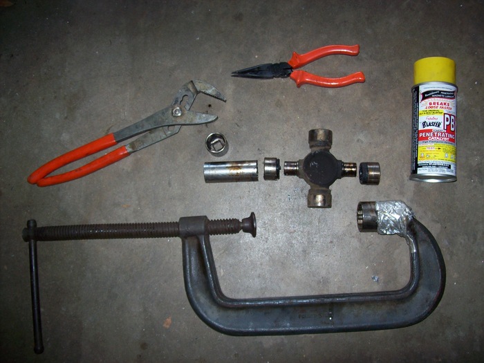 I USE APPROPRIATE SIZED SOCKETS TO "PUSH" AND "RECEIVE" CAPS AS THEY ARE BEING PUSHED. THEY MUST BE CLOSE IN INSIDE AND OUTSIDE DIAMETERS, AS THE "RECEIVER" MUST ALSO REST ON THE YOKE'S FACE, SOMETIMES DURING THE PROCESS.