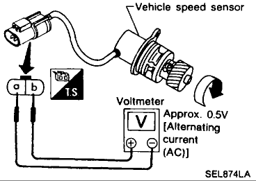 2. Turn vehicle speed sensor pinion quickly and measure voltage across (a) and (b).