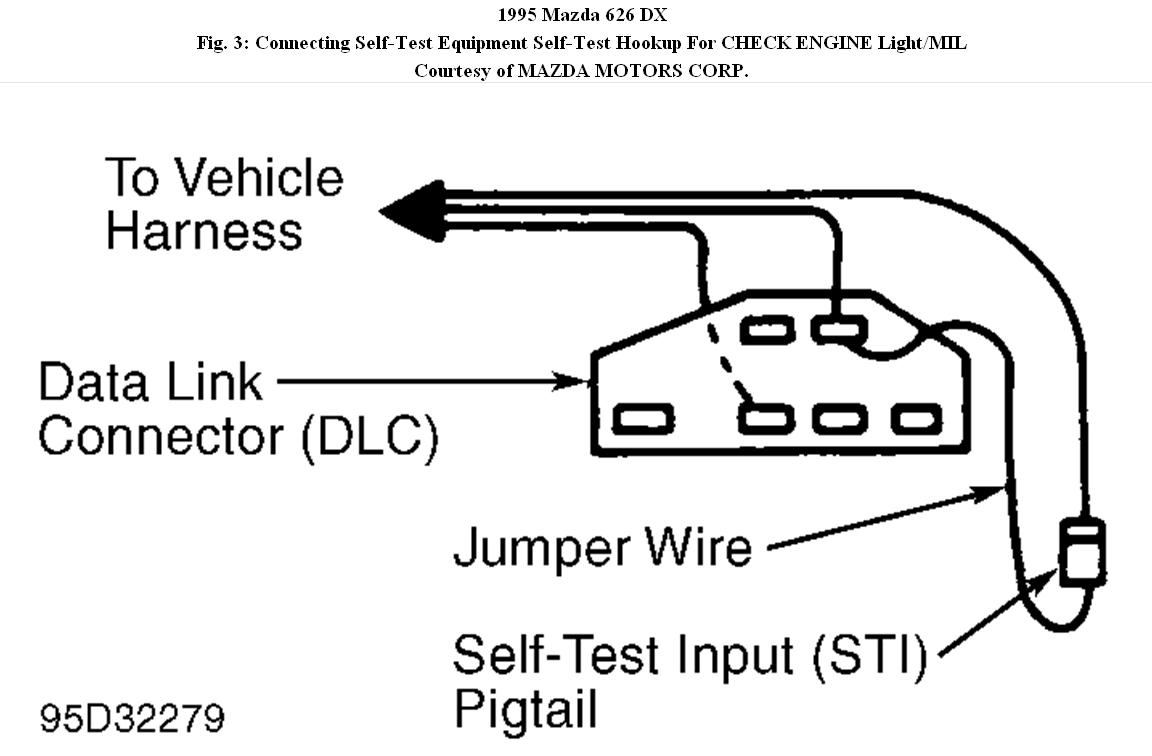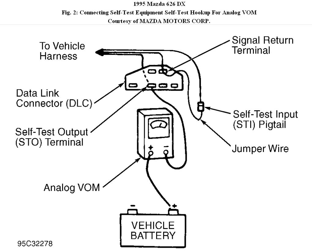 Turn ignition on. Connect a jumper wire between Self-Test Input (STI) pigtail and signal return (SIG RTN) terminal of Data Link Connector (DLC). See Fig. 2 -3. Go to KOEO SELF-TEST.