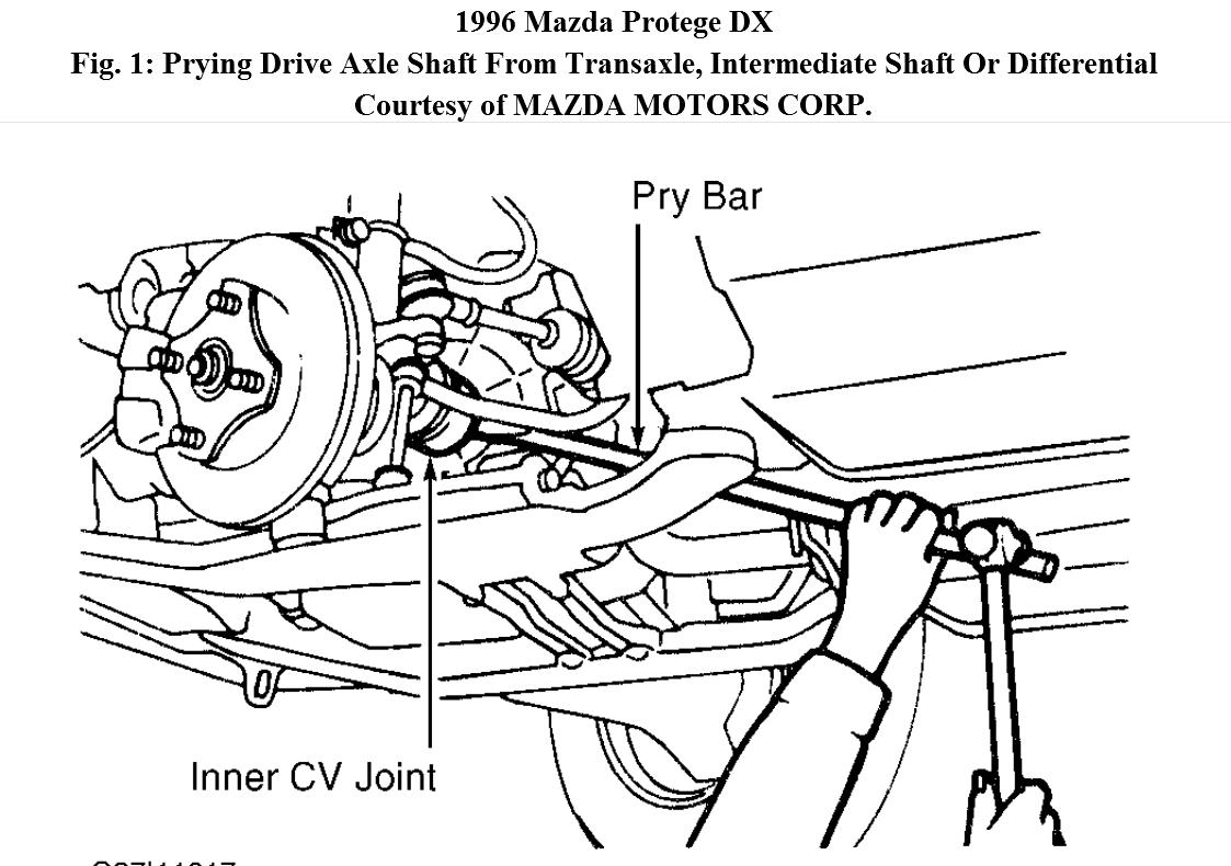 I am attempting to change the driver's side CV shaft on a 96 Mazda Protege. Despite several hours of prying, I am unable to get the last portion of the hollow cylinder out. I am using a 24 inch prybar and cannot seem to get enough leverage to either get behind it or get it to pop out. Do you have any suggestions?