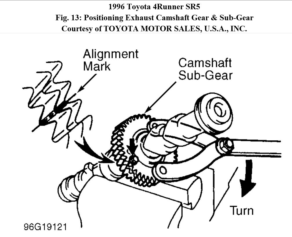1. If reassembling exhaust camshaft, install gear spring, sub-gear, wave washer and snap ring. Using spanner wrench, rotate sub-gear counterclockwise until holes in main gear and sub-gear are aligned. Ensure pins on the gears align with ends of gear spring. Temporarily install service bolt "A". See Fig. 13. Ensure gear teeth of main gear and sub-gear are aligned. Tighten service bolt.