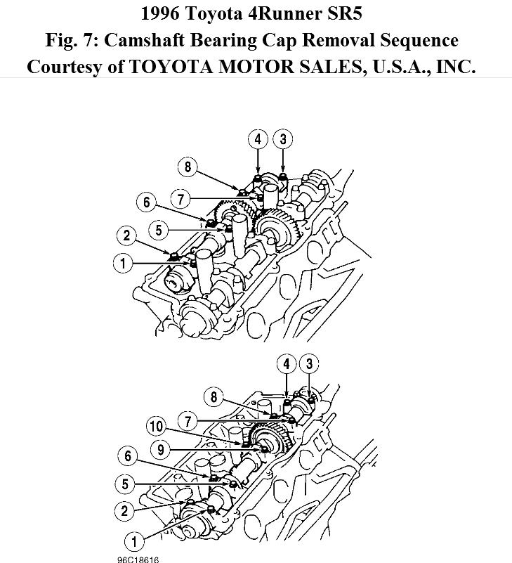 4. Install exhaust camshaft bearing caps in numerical order. Ensure arrow on top of camshaft bearing cap is pointing toward timing belt end of engine. Coat camshaft bearing cap bolt-to-camshaft bearing cap surface and bolt threads with engine oil. Install and tighten exhaust camshaft bearing cap bolts to specification in reverse order of removal sequence using several steps. See Fig. 7.