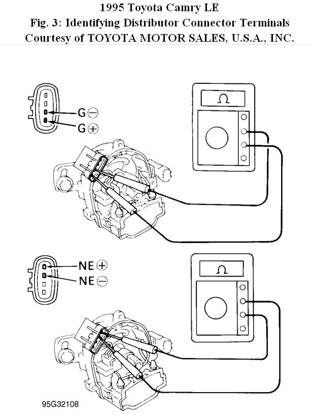 1. Ensure ignition is off. Disconnect distributor 4-pin connector. Using ohmmeter, measure resistance between specified terminals. See Fig. 3 . See G & NE PICK-UP COIL RESISTANCE table. If any resistance measurement is not within specification, replace distributor. If all measurements are within specification, go to next step.