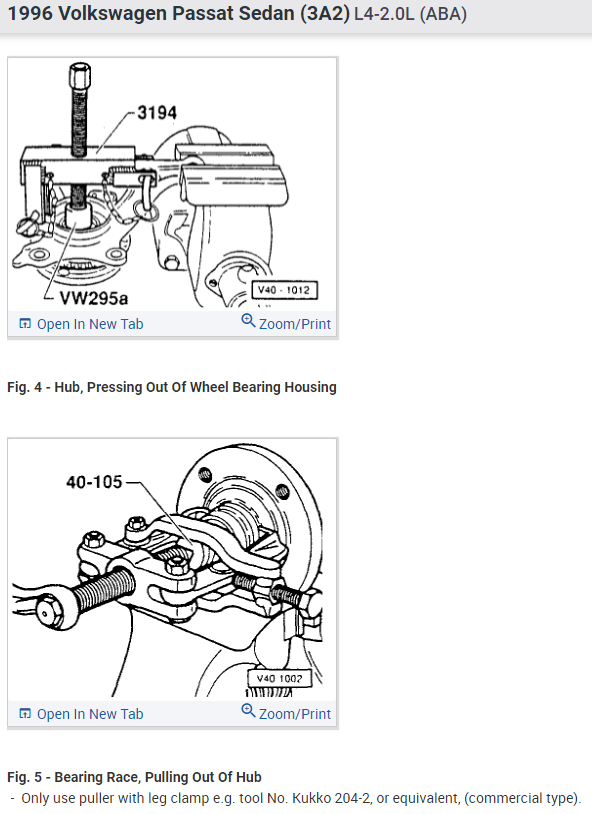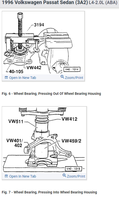 1996 VW Passat mileage: 116,000. There is a sound like driving over a grooved surface, but no vibration. The sound varies with car speed, and is not affected by engaging or disengaging the clutch (gear doesn't matter either). The sound gets very loud at highway speeds. I raised the car and spun each wheel. The right front wheel makes a rumbling sound when I spin it (the left front and the rears are silent). I think that I have a wheel bearing problem, but am not sure if I can change it myself or if I will need to pull the hub and have a machine shop press out the old one and press in the new one. Also, if I have to pull the hub, will I need to have it re-aligned? Any advice appreciated!
