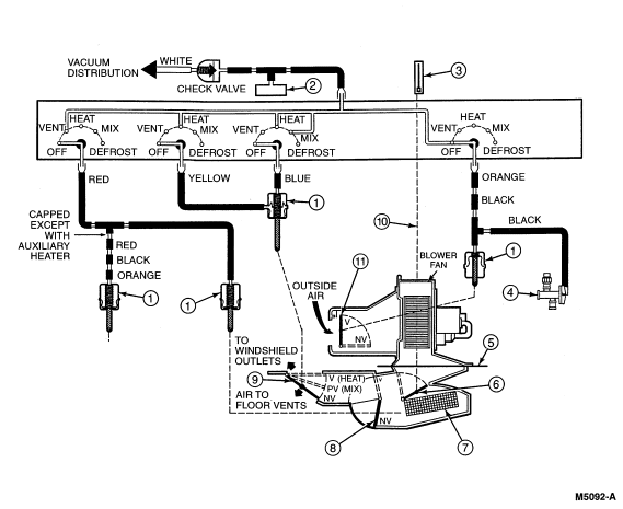 Positioning the temperature control **** in any position between COOL and WARM causes the temperature blend door to direct more or less outside air through or around the heater core for whatever proportion of heated or unheated outside air is desired.