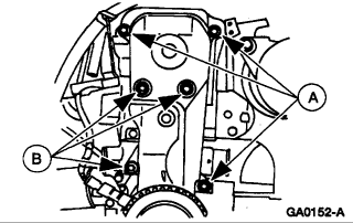 Remove the (A) three nuts and the (B) three bolts and remove the outer engine front cover.