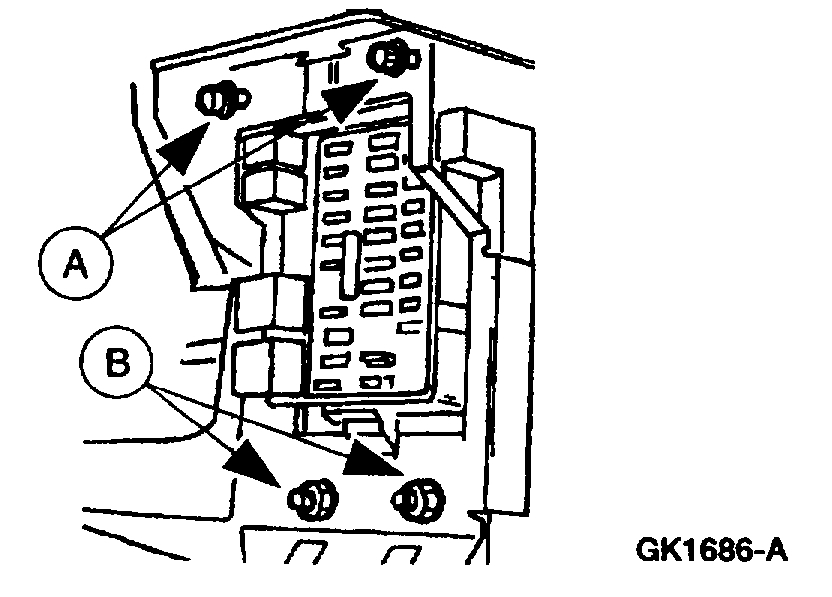 5. Remove the two (A) instrument panel fuse junction panel bolts and remove the two (B) interior fuse junction panel nuts.