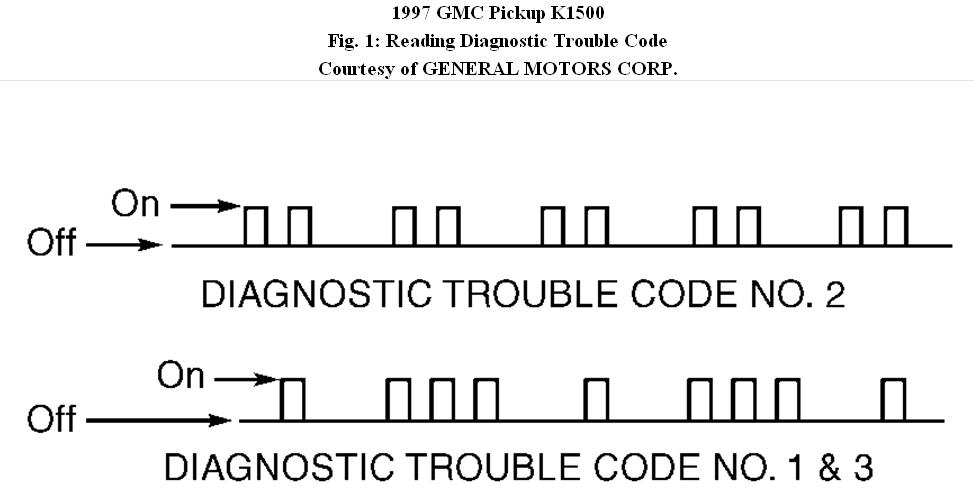 2. Turn ignition to run position (engine off). Observe shift select buttons. If all shift select buttons blink once at same time then stop, no DTCs are stored. If only one code is stored in TCCM memory, that code will blink repeatedly, with a 3 second delay between sequences. If more than one code is present, next code will flash after a 3 second delay, then sequence will repeat. Count number of blinks for each code. See Fig. 1.