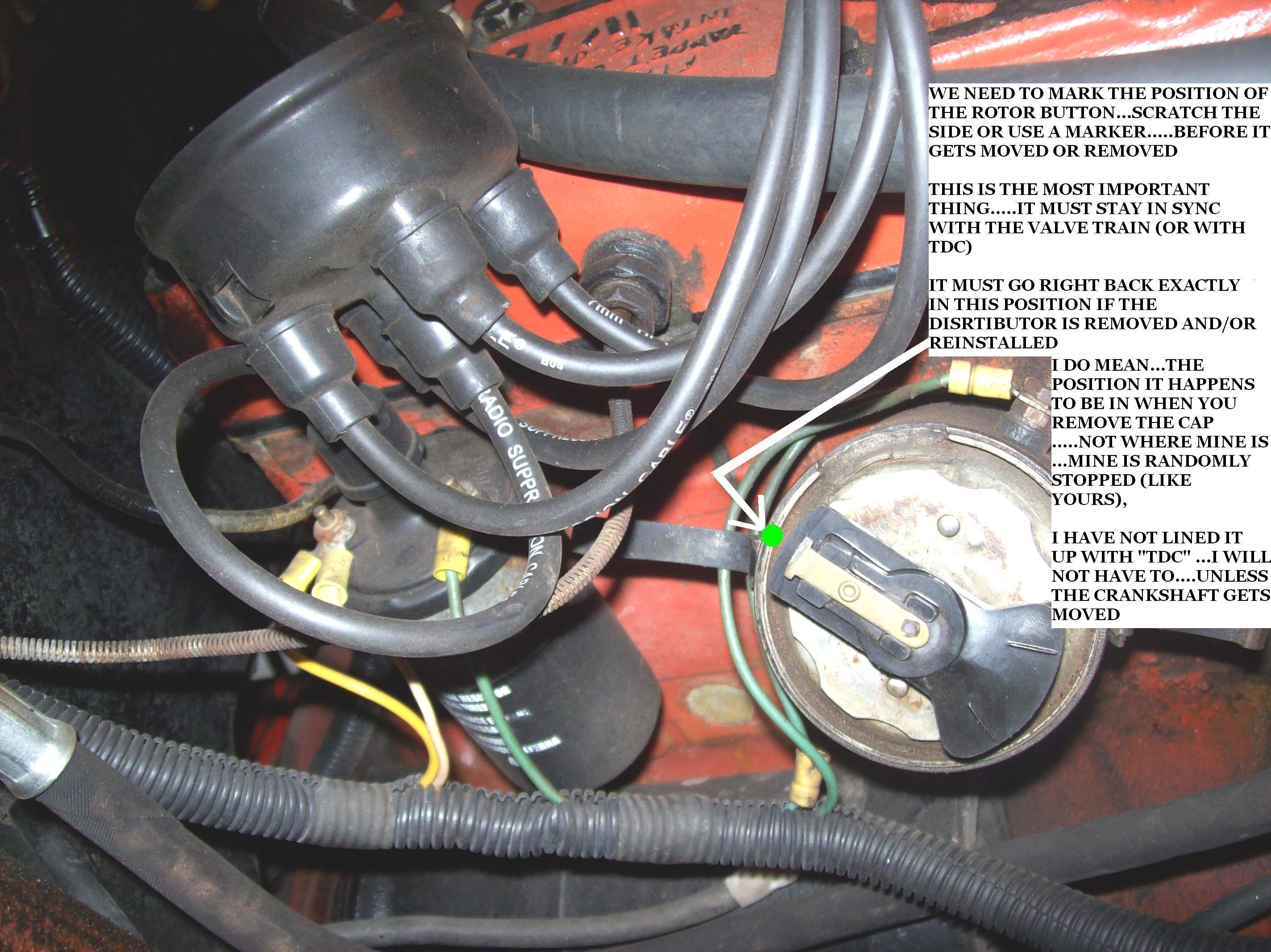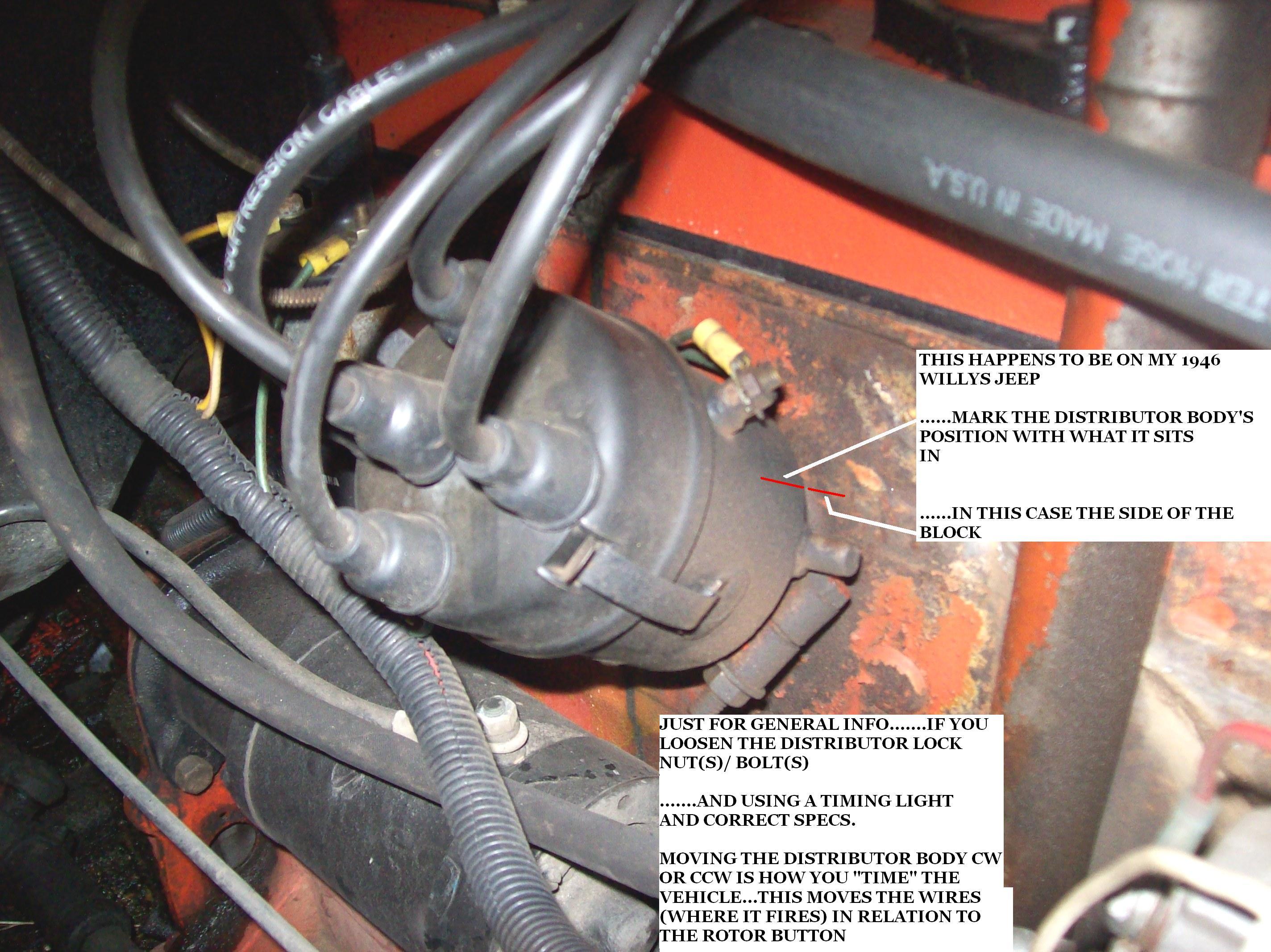 REMOVE THE DISTRIBUTOR CAPMARK THE SIDE OF THE DISTRIBUTOR BODY, WHERE THE ROTOR BUTTON IS POINTING. SEE MY PIC OF MY JEEP'S DISTRIBUTOR
