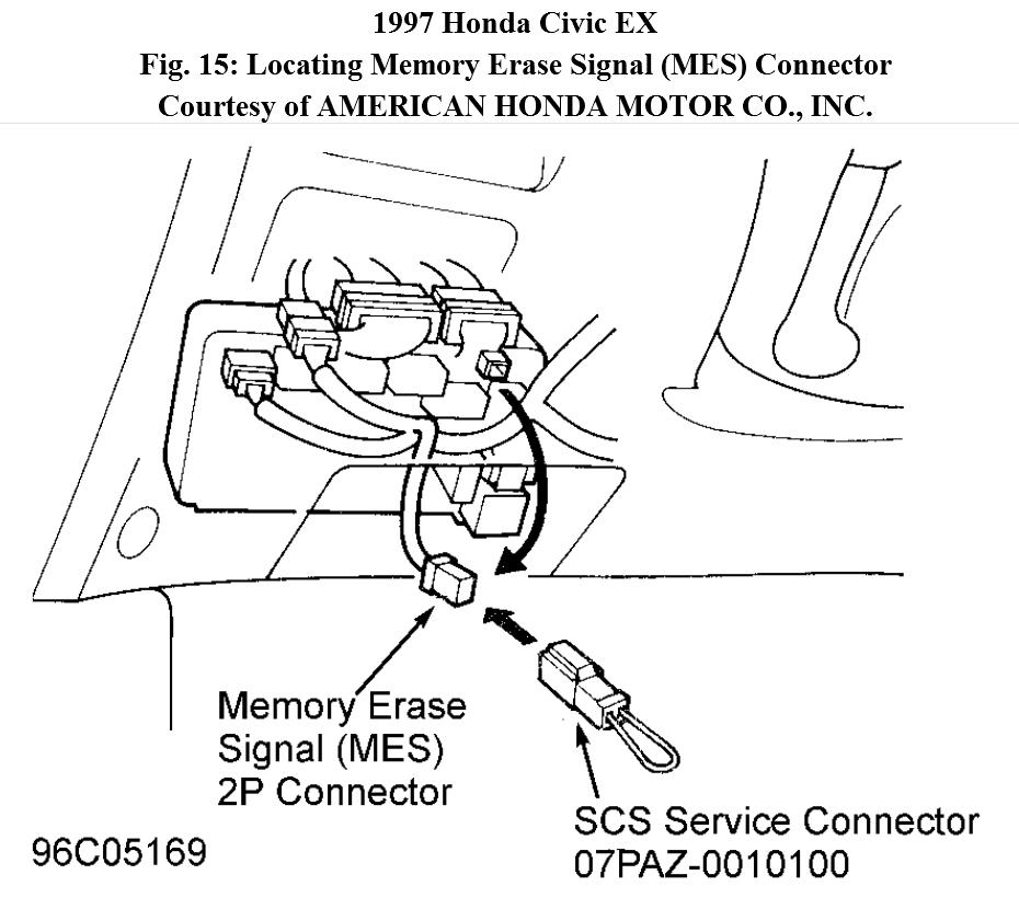 1. Turn ignition switch OFF. Wait 10 seconds to ensure DTC memory is erased. Connect SCS Service Connector to MES connector (yellow or Orange color connector). See Fig. 15.