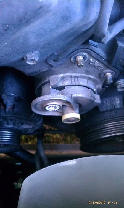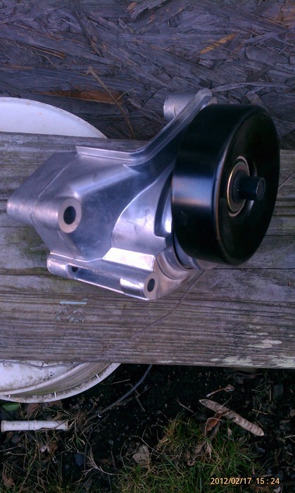 The idler pulley is at the top right of the engine (if you are looking at it from the front of the car). Using either a long breaker bar on the belt tensioner pulley bolt, take the pressure off the serpentine belt - this is the belt that drives your alternator, water pump, power steering and fan, etc. Don't horse anything - you should not have to push too hard to know if you are taking the tension off the belt! Once you do that, slip the belt off the tensioner pulley and slowly let the pressure off the belt tensioner pulley. Next remove the belt off the idler pulley and using correct sized socket with the breaker bar or a hefty wrench, remove the idler pulley bolt. If the idler pulley is really shot to bits, it may come off in pieces; if not, there should be one center bolt and a largish washer. Don't lose the washer or bolt since your new part does not come with those (mine didn't!). Replace everything in the same order.