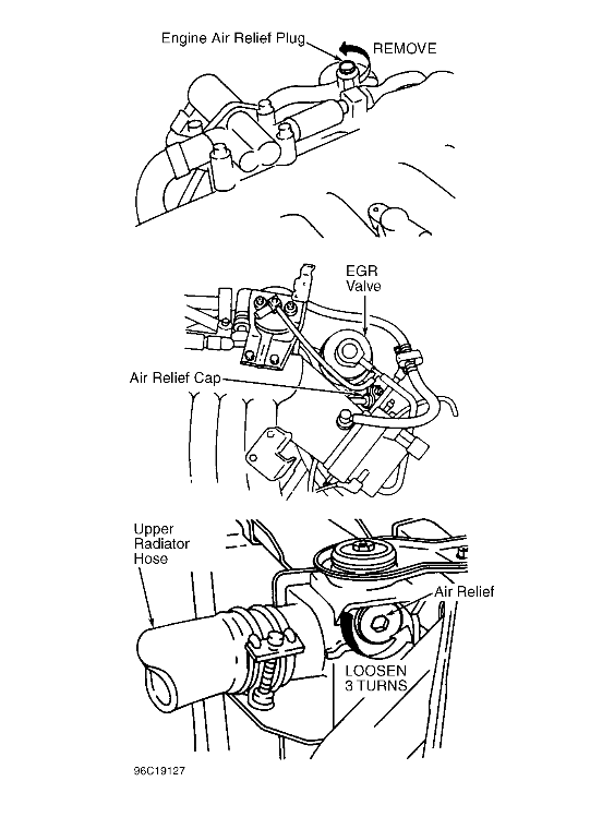 1. Loosen engine and radiator air relief plugs. Remove heater pipe air relief cap. See Fig. 4Â. Connect one end of 40" clear,  heat resistant hose to heater pipe relief. Fill coolant reservoir to MAX mark and place hose