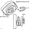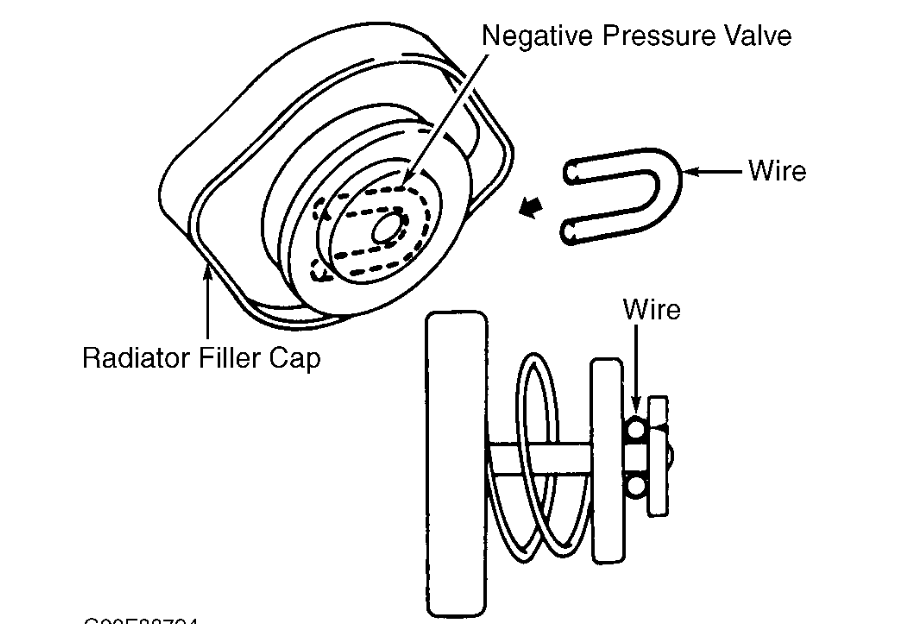 3. Continue adding coolant while gently moving upper radiator hose up and down until coolant level no longer drops in filler neck. Place wire under radiator filler cap negative pressure relief valve. See Fig. 6Â. DO