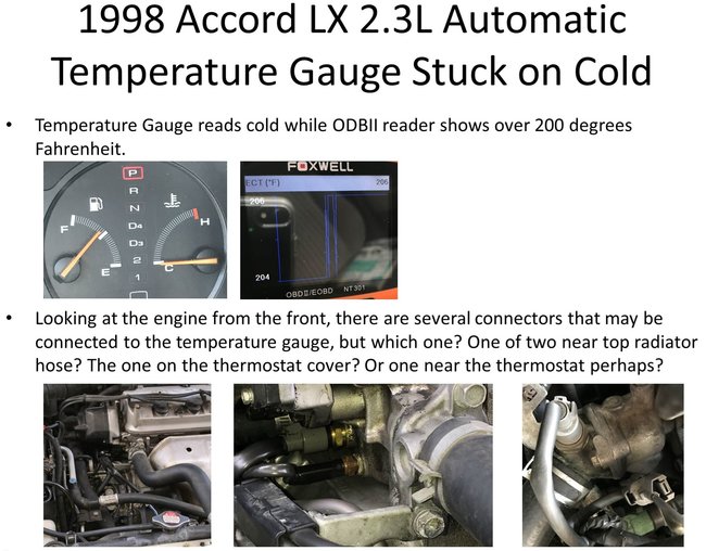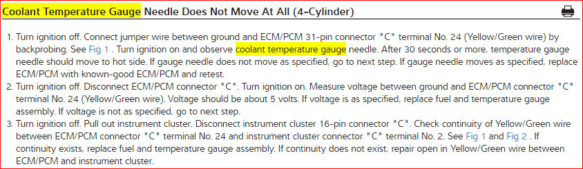 I expected the fan on the passenger side of the car to come on if the ECT reached a high enough temperature, but that never happened while the car was sitting in the driveway. I wondered if the sensor driving the fan might be the same one that drives the temperature gauge that is not working.