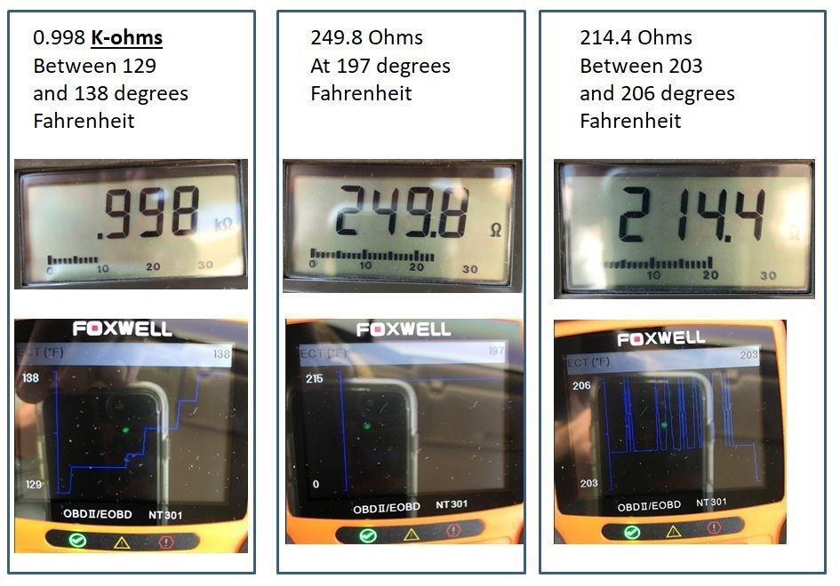 I drove the car with the A/C turned on in an ambient temperature range of 88 to 90 degrees Fahrenheit. I used the OBD II reader to monitor the ECT while driving. It plots the data, with a new sample data reading every few seconds. The car seemed to stay around 195 degrees while driving, perhaps getting up to 197 climbing a hill. It got as high as 204 to 206 degrees when stopped at a light. I could not tell if the fan ever came on while driving. I parked the car and turned off the engine, then turned the key to the on position without starting the engine. The temperature continued to rise. It got to 215 and the fan came on (with the A/C turned off). That seems higher than I would have expected, but the fan did come on, so if the same sensor drives the temperature gauge and the fan switch, the sensor seems to be working.