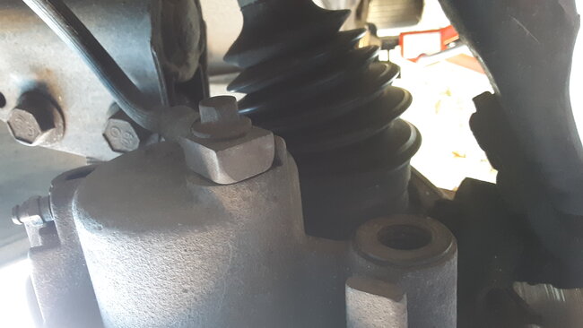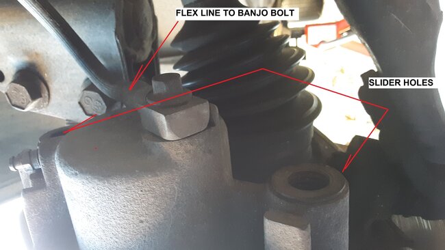 First, the caliper, itself, appears to have been installed without the two slider bolts which thread into the ends of the sliders. As you can see from the photo, only a hole is left on each slider end, where the bolts (15mm?) Belong. I have drawn an arrow where each of the two holes is visible.