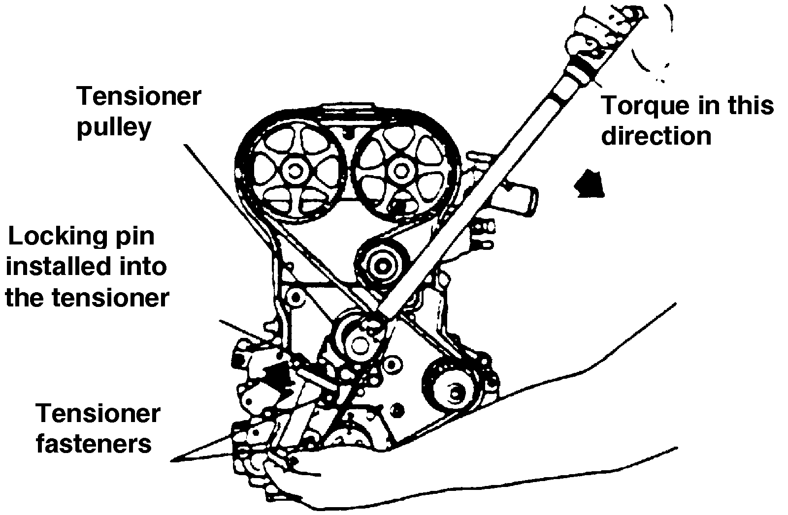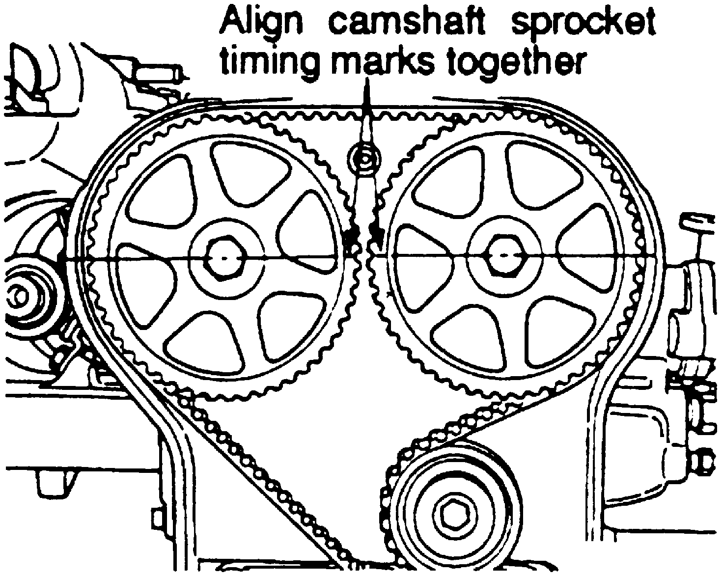 4. Align timing marks on camshaft intake and exhaust sprockets before loosening belt tensioner to remove timing belt, Ensure camshaft and crankshaft are not rotated after belt is removed.