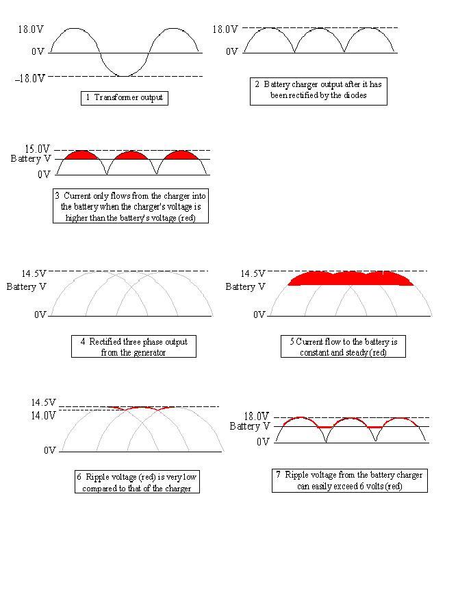 Since you appear to understand electrical theory, it might make sense that a battery charger will not exhibit the same characteristics as when the battery is charging in the car. Chargers put out a rectified single-phase sine wave but generators put out a more steady rectified three phase output. For a large percentage of the time, a charger's output voltage is less than 12 volts, and it even hits 0 volts momentarily so it takes a lot longer to charge the battery that way.