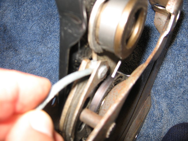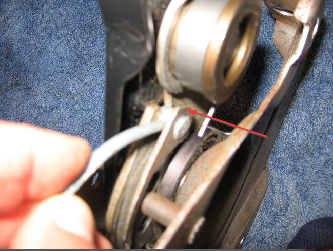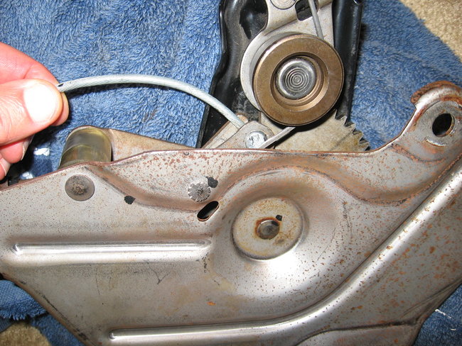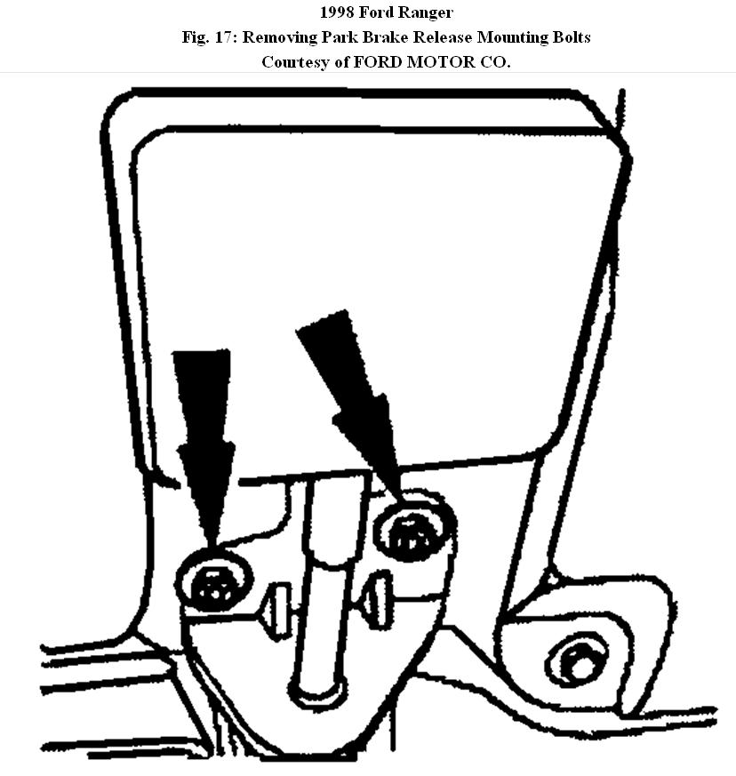4. Remove the front parking brake cable and conduit from the bracket by compressing the retainer from the front parking brake cable and conduit from the bracket. See Fig. 16. Remove the front parking brake cable and conduit from the bracket. Remove the parking brake release mounting bolts. See Fig. 17.