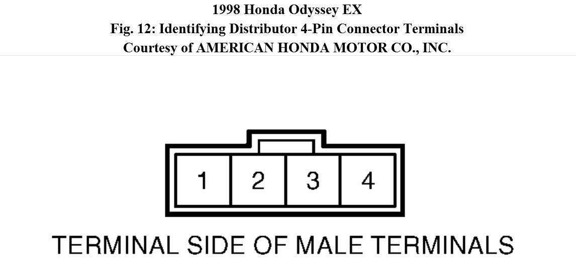 3. Turn ignition off. Disconnect distributor 4-pin sensor connector. Measure resistance between distributor sensor terminals No. 3 (Yellow wire) and No. 4 (Black wire). See Fig. 12. If resistance is 800-1500 ohms, go to next step. If resistance is not 800-1500 ohms, replace distributor housing.