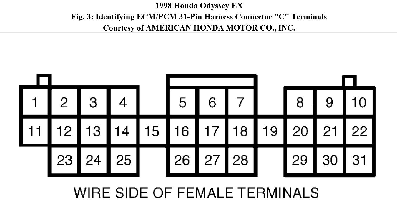 5. Ensure ignition is off. Reconnect distributor 4-pin connector. Disconnect PCM 31-pin connector "C". Using backprobe kit, measure resistance between PCM 31-pin connector "C" terminal C29 (Yellow wire) and terminal C30 (Black wire). See Fig. 3. If resistance is 800-1500 ohms, go to next step. If resistance is not 800-1500 ohms, repair open in Yellow wire and/or Black wire between PCM and distributor.