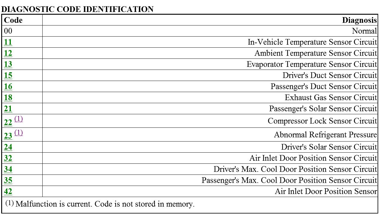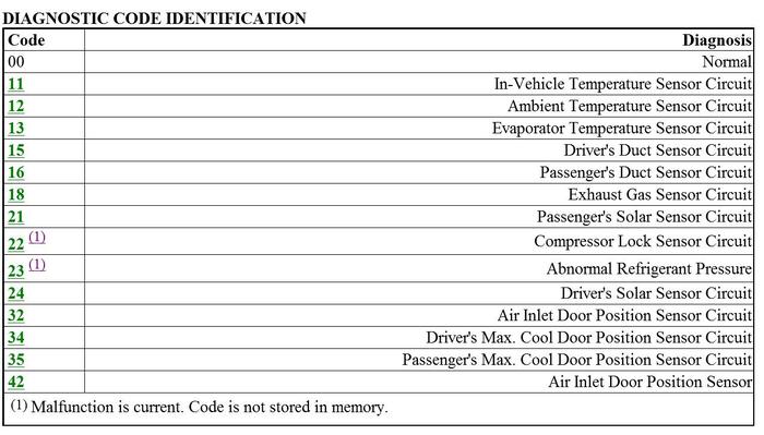 2. After indicator check is complete, system will enter self-diagnostic mode. Stored trouble codes will appear in sequence on driver side temperature display.