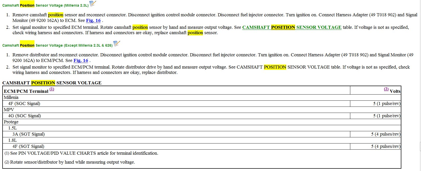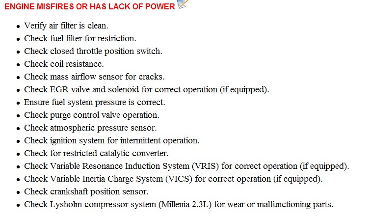 I am providing you with the troubleshooting checklist from the service manual for the car. It has the aforementioned items on it.