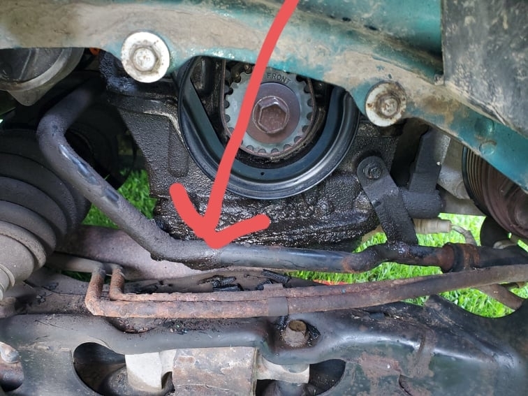 No, it definitely comes out of the lower radiator hose and it has coolant leaking from it not transmission fluid. The rubber hose at the right side of the picture is the bottom radiator hose. The metal line I'm referring to looks like it is hooked into this part of the bottom radiator hose.