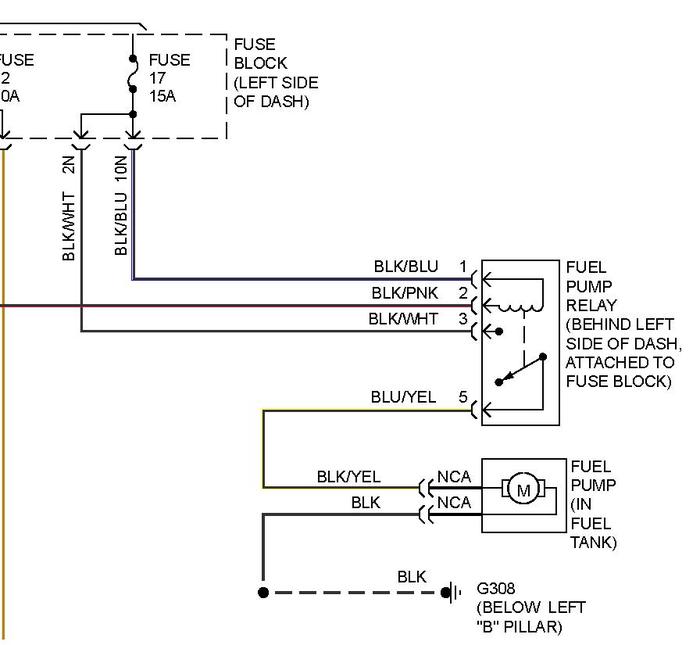 I have tested the fuel pump by putting 12 volts directly from a spare battery and the pump worked. I traced the pump wires all the way up to the front drivers door under the trim and I put 12 volts battery power directly to them and the pump worked. I found and tested the fuse and it was ok. I swapped out fuel pump relays and the fuel pump still did not work. The fuel pump relay is the brown relay on the fuse panel top right on the drivers side under dash right?