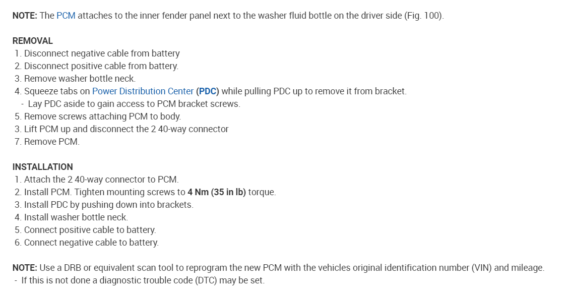 NOTE: Use a DRB or equivalent scan tool to reprogram the new PCM with the vehicles original identification number (VIN) and mileage.