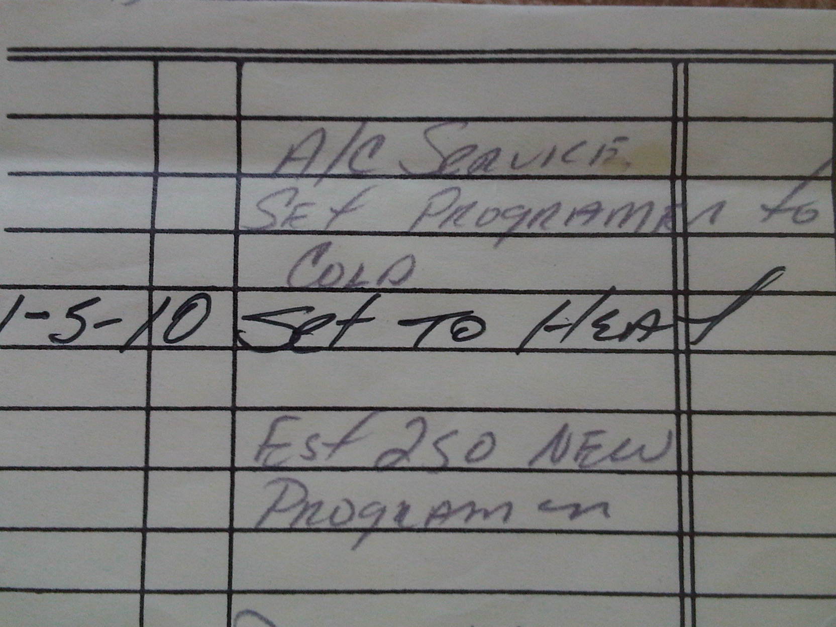 1999 Chevrolet Blazer heat and air conditioner work but don't know how to set program. Only blowing heat right now. This is what is on the receipt. "A/c service, set program to cold (6-03-10)". (11-5-10) went back and on receipt "set to heat". He said, he was not sure how far to turn "it". He did have a long screwdriver in his hand (about 2 feet long). Can you tell me what he turned so I can fix it myself. Thank you for your time.