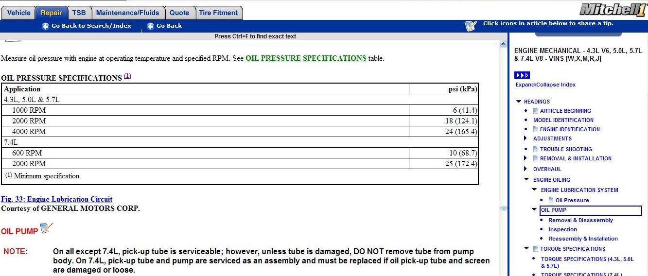 USING A MECHANICAL GAUGE (MORE ACCURATE THAN AN ELECTRICAL GAUGE)) AND THE SCREENSHOT FOR "PRESSURES"---SEE IF THIS IS WHAT IS "ACTUALLY" GOING ON......IF SO, OIL PRESSURE IS "REALLY" OK.........THEN THE PROBLEM LIES SOMEWHERE BETWEEN THE SENDER AND THE ORIGINAL GAUGE