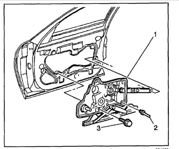 7. Install the door window regulator cam bolt. Tighten the nut to 89 INCH Lbs. (10 N.M).