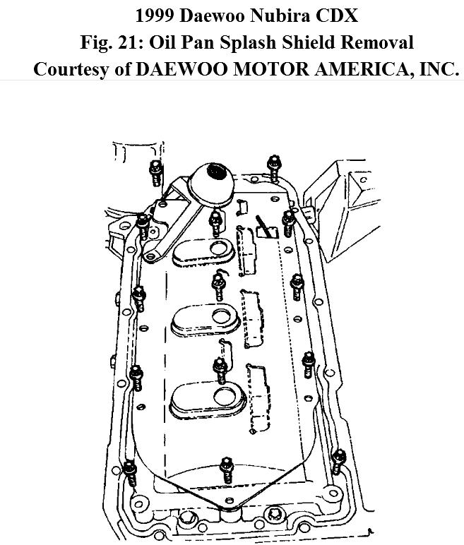 2. Clean oil pan attaching bolt holes in engine block. Clean oil pan splash shield. See Fig. 21.