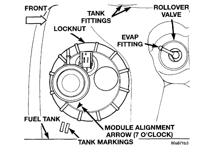 1. Using a new gasket, position fuel pump module into opening in fuel tank. Be sure rubber gasket remains in place. Rotate module assembly until module alignment arrow is at 7 o'clock position. This step must be followed to prevent float/float rod from contacting sides of fuel tank.