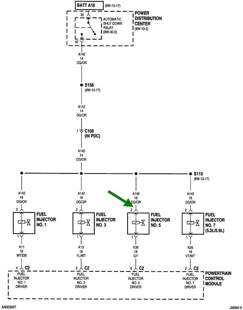 Another way to approach this is to see if the ASD relay is turning on by monitoring the voltage on that line. You can use a digital voltmeter, but they respond rather slowly. A test light works better for this test. Look for the wire that is the same color at the ignition coil(s), and all the injectors. These diagrams are for the 5.2L engine, but the method is the same for the others. The most commonly used wire is dark green / orange. Touch the test light's probe to that wire on the ignition coil or back-probe through the rubber weather seal on any injector. You can also use either smaller terminal on the back of the alternator for this test.