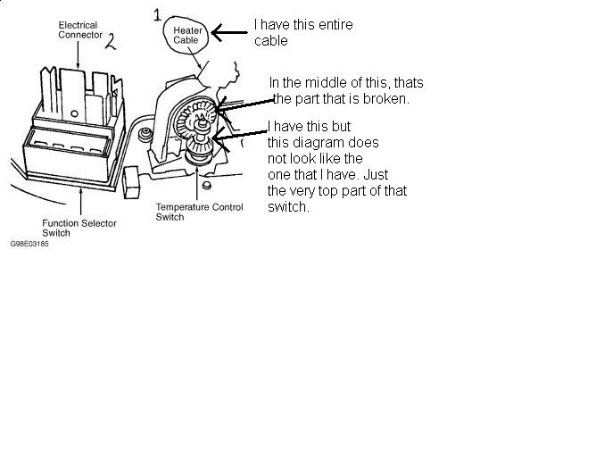 I unhooked the temperature control cable from the side of my dash that is right by my gas pedal. I took that into an auto parts store and they said that they dont carry that. I can tell that where I am suppose to hook that temperature control cable into the back of my temperature control switch, it looks like there is something broken off. I need to know what that piece is? I have the cable and all, but the only part that is broken is where you plug the cable to the actual temperature control ****. What is that called and where could I find one without having to go to the Ford dealership?