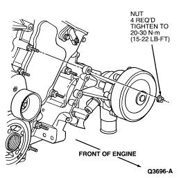 Install the alternator and power steering belts. Final tighten the water pump pulley retaining bolts to 15-22 ft. lbs. (22-30 Nm).