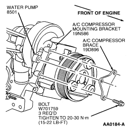 Install the automatic belt tensioner assembly. Tighten the two retaining nuts and bolt to 35 ft. lbs. (47 Nm).
