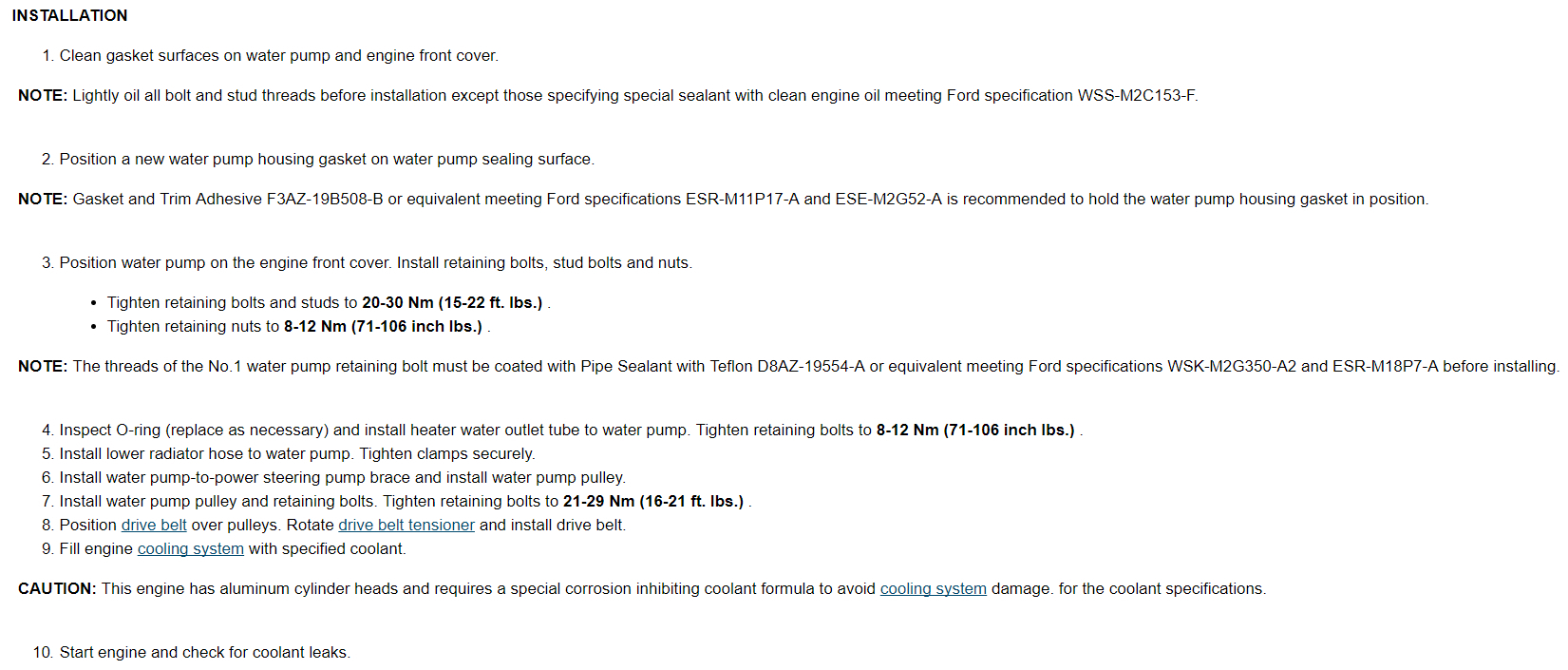 1. Install gasket using Gasket and Trim Adhesive (D7AZ-19B508-AA). To complete installation, reverse removal procedure. Lightly oil threads of bolt and stud not containing thread sealant. 2. If bolts originally contained thread sealant, clean and reapply thread sealant to bolts. Tighten bolts and nuts to specification. See TORQUE SPECIFICATIONS table. Fill cooling system. 3. Bleed air from cooling system by removing vent plug from elbow on intake manifold behind thermostat housing. DO NOT rotate plastic cap under vent plug, or gasket may be damaged. Fill cooling system until coolant flows from vent plug. Install and tighten vent plug to 11 ft. Lbs. (15 N.M).