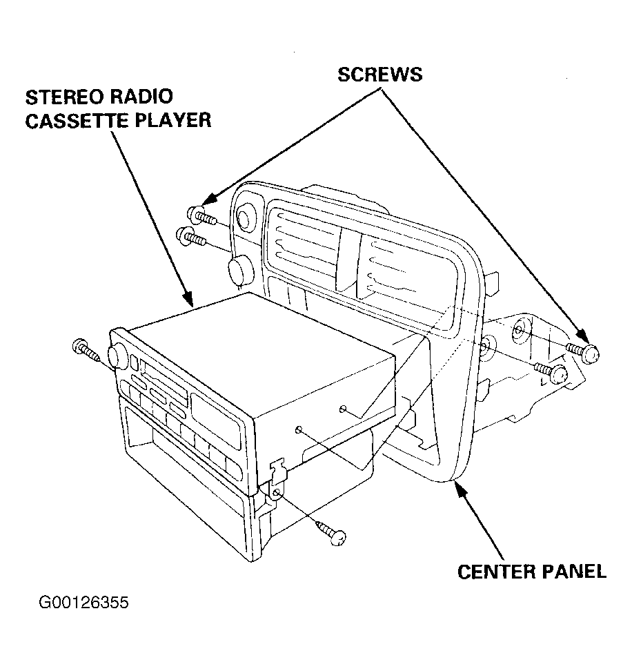 Remove the 4 mounting screws, and disconnect the 20P connector and the antenna lead. Remove the stereo radio/cassette player. See Fig. 12.